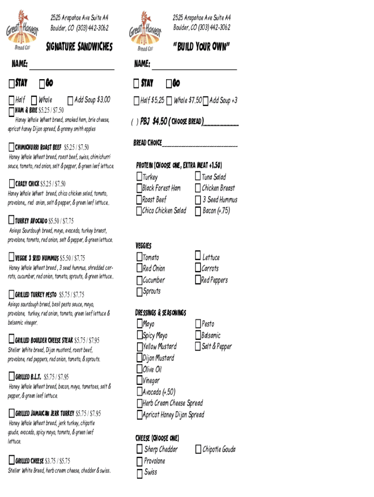 Name: Stay Half2525 Arapahoe Ave Suite A4 Boulder, CO (303) 44230622525 Arapahoe Ave Suite A4 Boulder, CO (303) 4423062Signature SandwichesBuild Your Own Name:Go Whole Soup $3.00ham & Brie $5.25 /