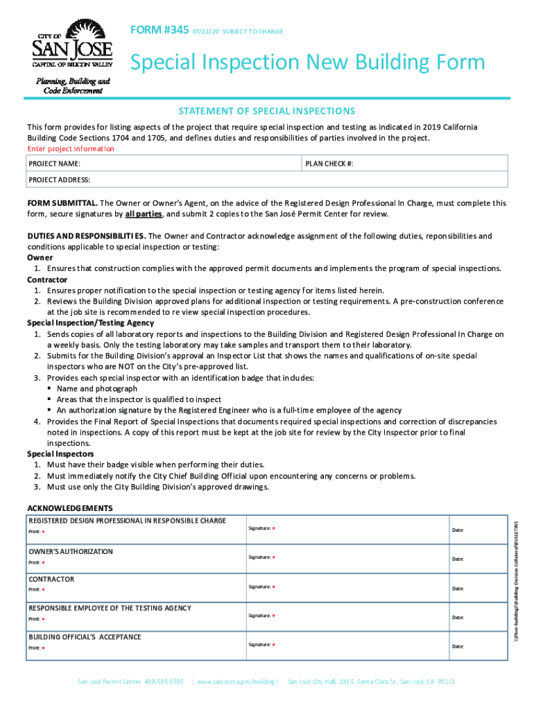 FORM #345 07/22/20 SUBJECT TO CHANGESpecial Inspection New Building Form