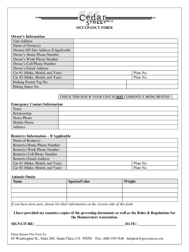 OCCUPANCY FORM Owners Information Unit Address Name of Owner(s) Owners Offsite Address If Applicable Owners Home Phone Number Owners Work Phone Number Owners Cell Phone Number Owners Email Address