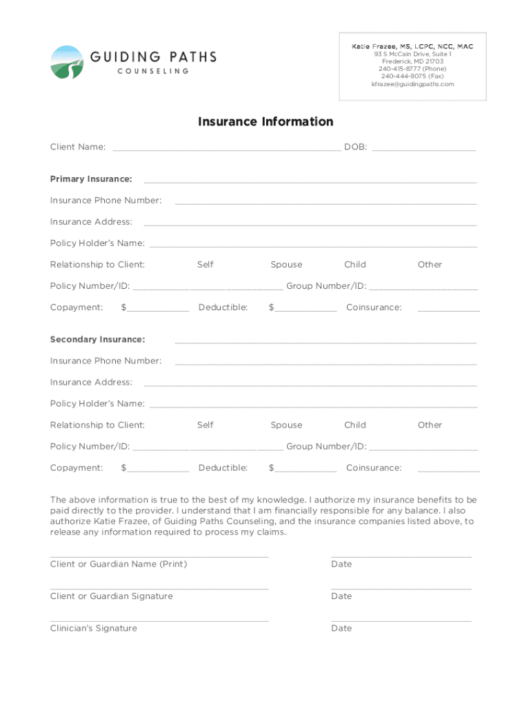 Katie Free, MS, CPC, NCC, MAC 93 S McCain Drive, Suite 1 Frederick, MD 21703 2404158777 (Phone) 2404448075 (Fax) free guiding paths. Coinsurance InformationClient Name: DOB: Primary Insurance: Insurance