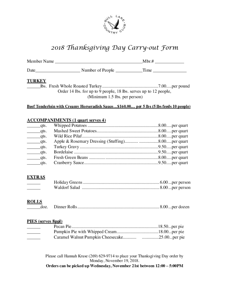 2018 Thanksgiving Day Carryout Remember Name MBR.# Date Number of People Time TURKEY lbs. Fresh Whole Roasted Turkey ..................................................7.00.....per pound Order 14 lbs.