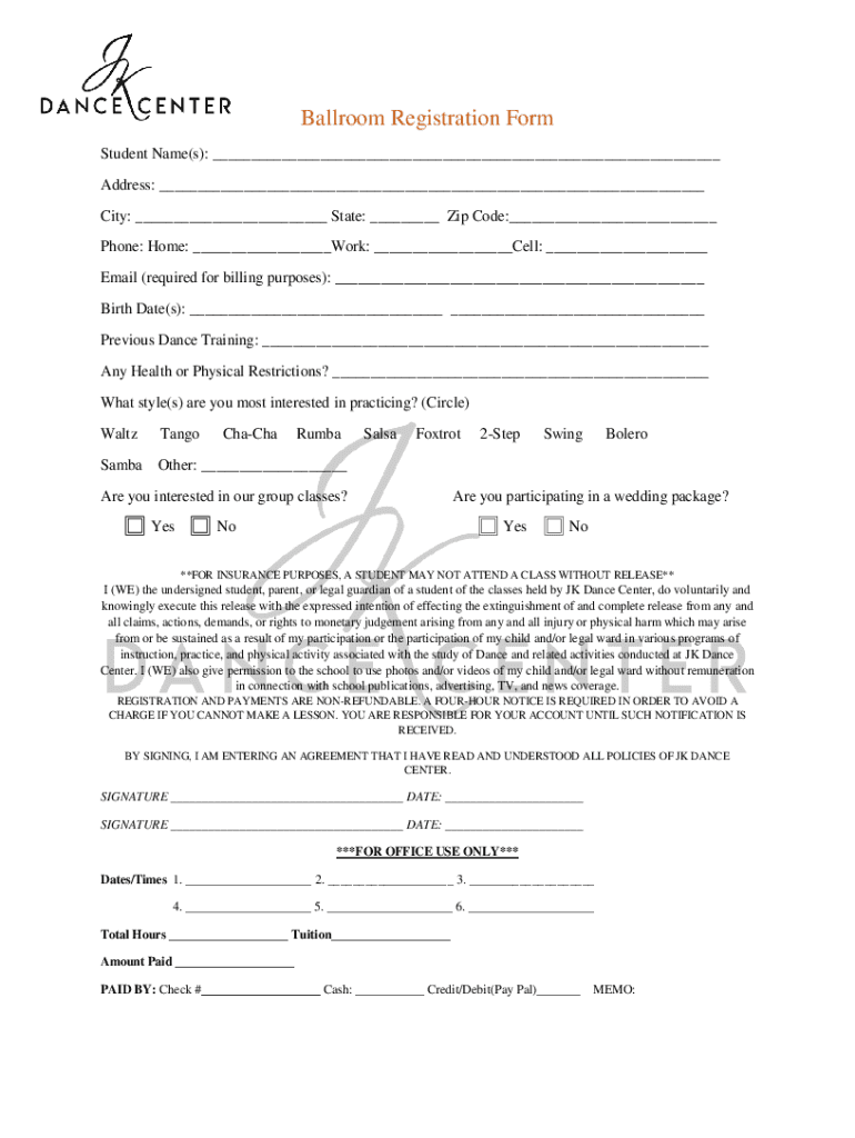 Ballroom Registration Form Student Name(s): Address: City: State: Zip Code: Phone: Home: Work: Cell: Email (required for billing purposes): Birth Date(s): Previous Dance Training: Any Health or Physical