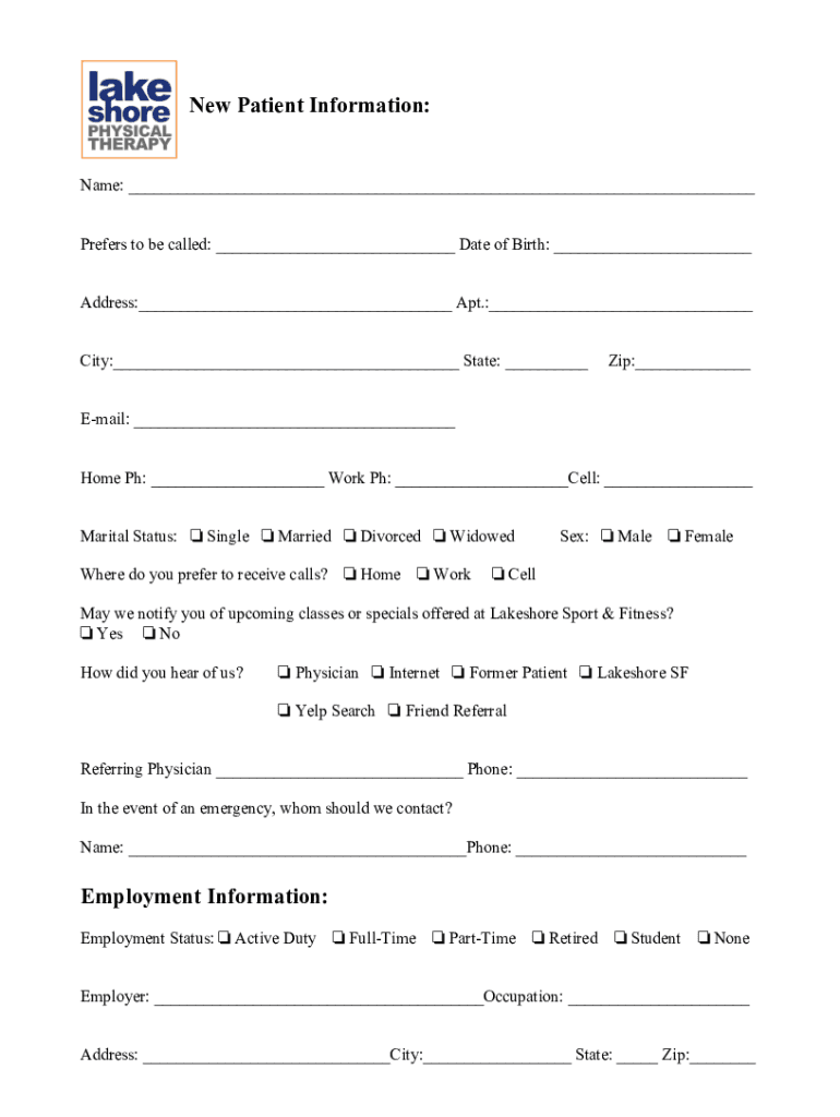 New Patient Information:Name: Prefers to be called: Date of Birth: Address: Apt.: City: State: Zip: Email: Home pH: Work pH: Cell: Marital Status: Single Married Divorced Widowed Where do you prefer