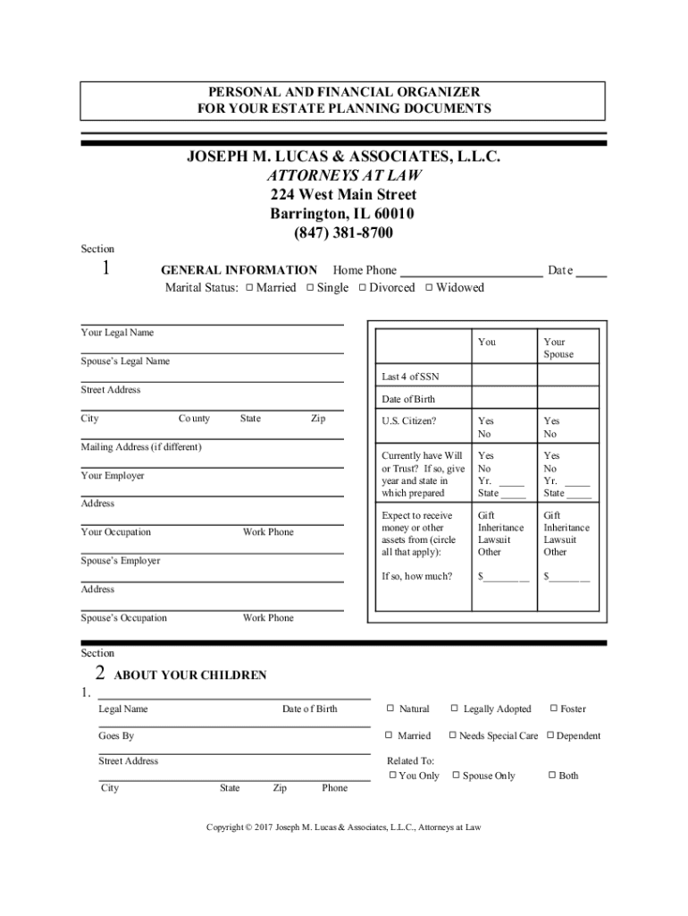 PERSONAL AND FINANCIAL ORGANIZER FOR YOUR ESTATE PLANNING DOCUMENTSJOSEPH M. LUCAS & ASSOCIATES, L.L.C. ATTORNEYS AT LAW 224 West Main Street Barrington, IL 60010 (847) 3818700 Section1GENERAL INFORMATION