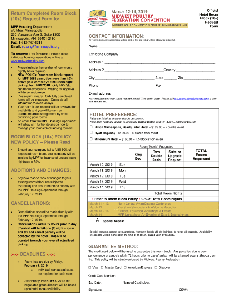 Official Hotel Room Block (10+) Request FormReturn Completed Room Block (10+) Request Form to: MPH Housing Department c/o Meet Minneapolis 250 Marquette Ave S, Suite 1300 Minneapolis, MN 554012180