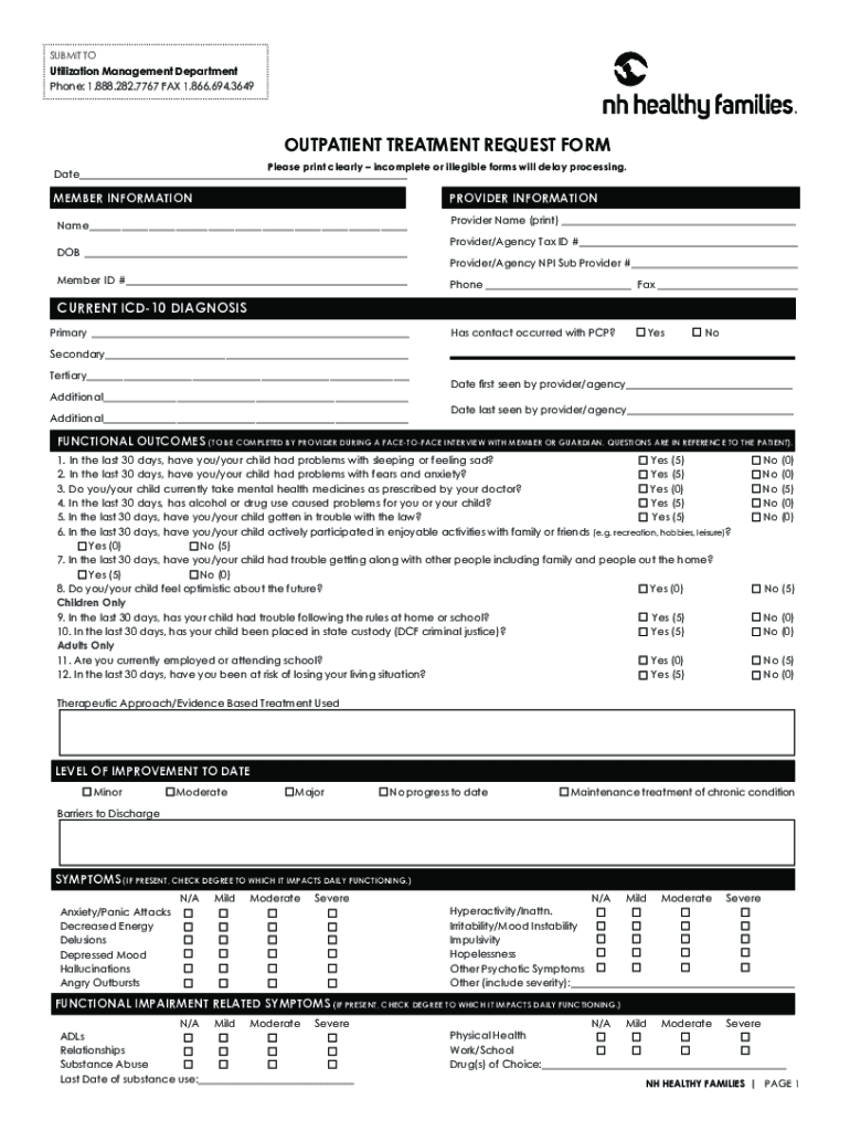 SUBMIT Utilization Management Department Phone: 1.888.282.7767 FAX 1.866.694.3649OUTPATIENT TREATMENT REQUEST FORM Please print clearly incomplete or illegible forms will delay processing. Date MEMBER