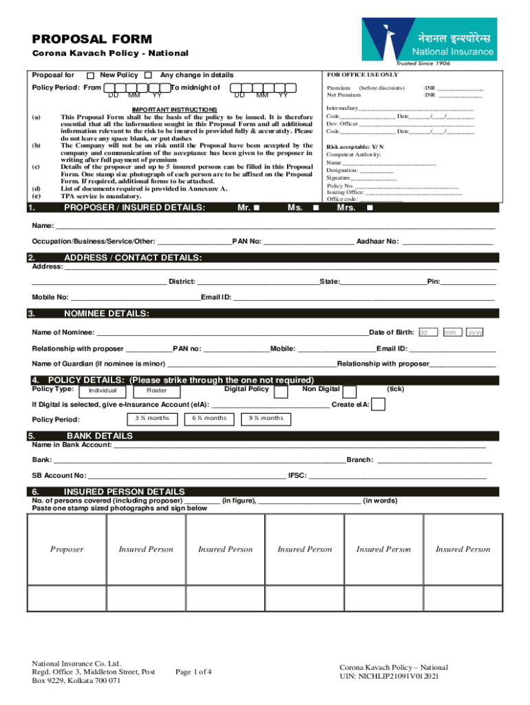 PROPOSAL FORM Corona Karachi Policy National Proposal former Policy change in detailsPolicy Period: From OFFICE USE Only midnight of DDMMYYDDMMPremium (before discounts) Net PremiumYYIMPORTANT INSTRUCTIONS(a)(b)