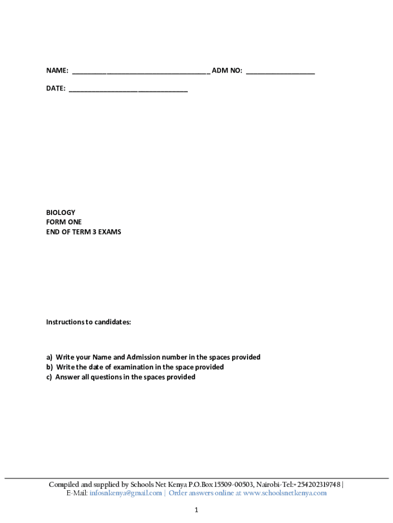 NAME: ADM NO: DATE: BIOLOGY FORM ONE END OF TERM 3 EXAMSInstructions to candidates:a) Write your Name and Admission number in the spaces provided b) Write the date of examination in the space provided