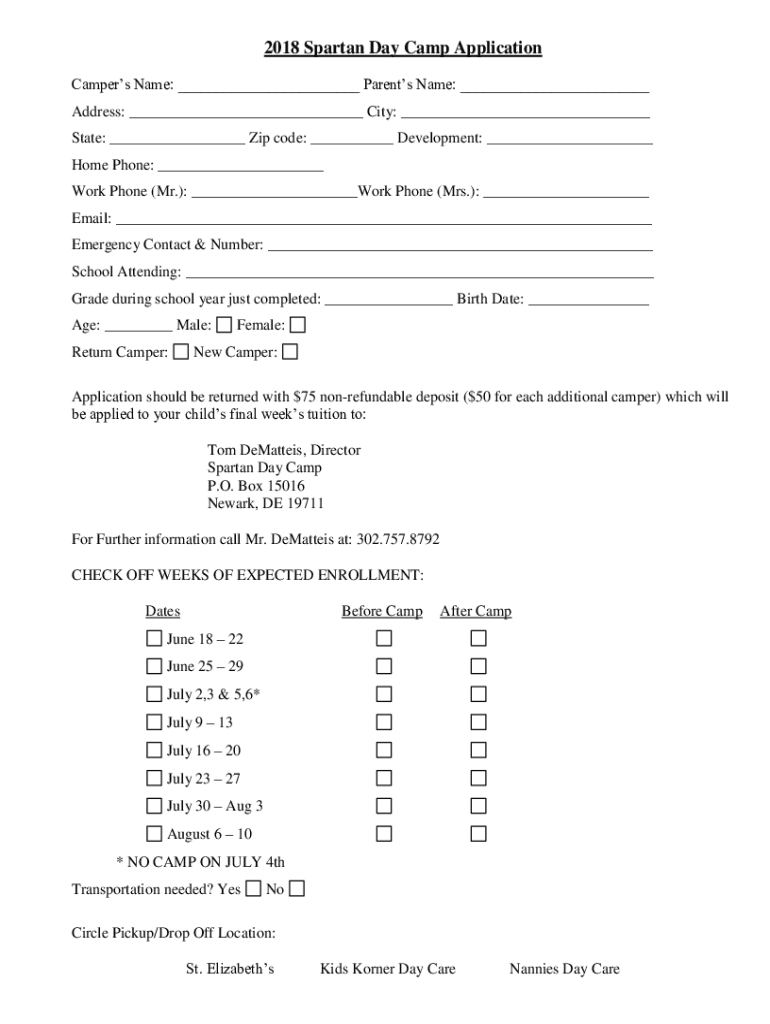 2018 Spartan Day Camp Application Campers Name: Parents Name: Address: City: State: Zip code: Development: Home Phone: Work Phone (Mr.): Work Phone (Mrs.): Email: Emergency Contact & Number: School