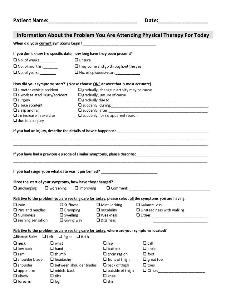Patient Name: Date: Information About the Problem You Are Attending Physical Therapy For Today When did your current symptoms begin? If you don 't know the specific date, how long have they been present?