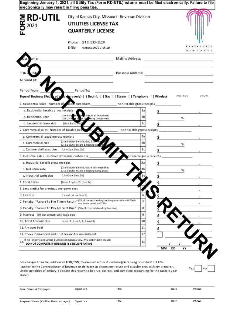 Beginning January 1, 2021, all Utility Tax (Form RUTILE) returns must be filed electronically. Failure to file electronically may result in filing penalties. Utility of Kansas City, Missouri Revenue