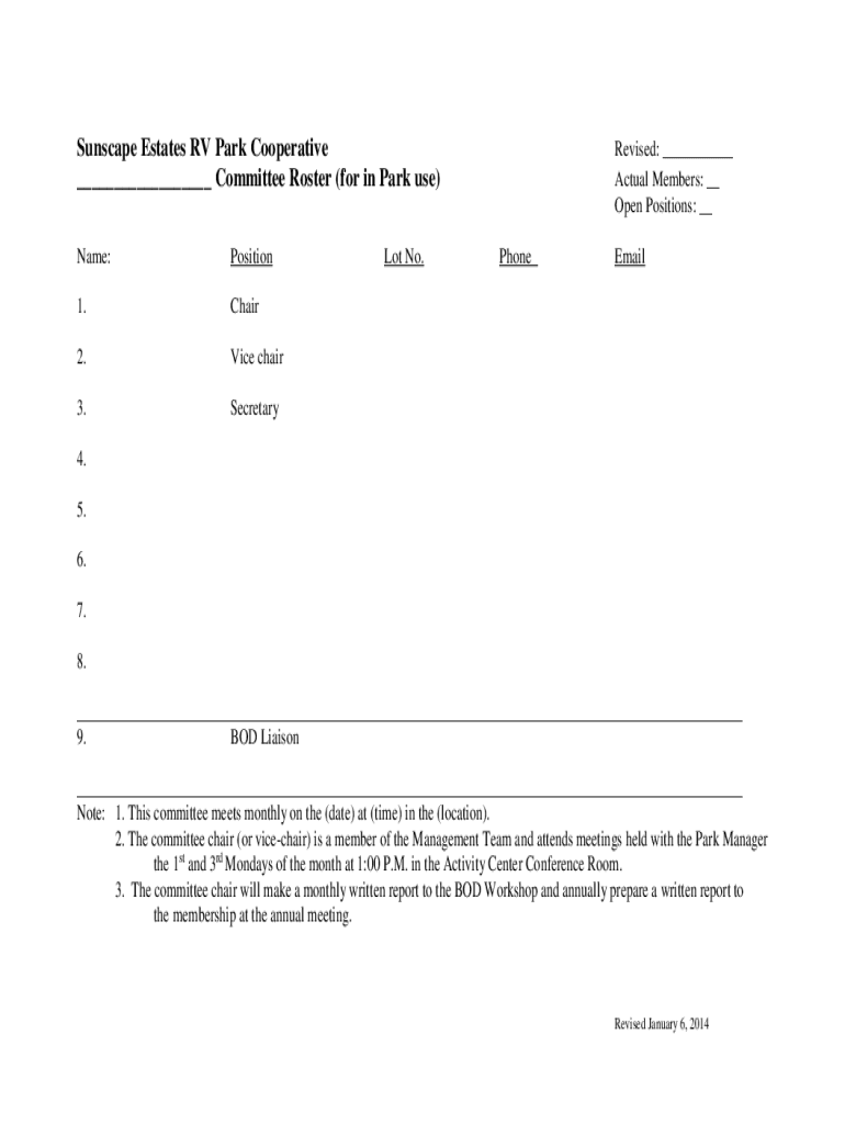 Suns cape Estates RV Park Cooperative Committee Roster (for in Park use) Name:Position1. Chair2. Vice chair3. Secretary Lot No. Revised: Actual Members: Open Positions: PhoneEmail4. 5. 6. 7. 8. 9.