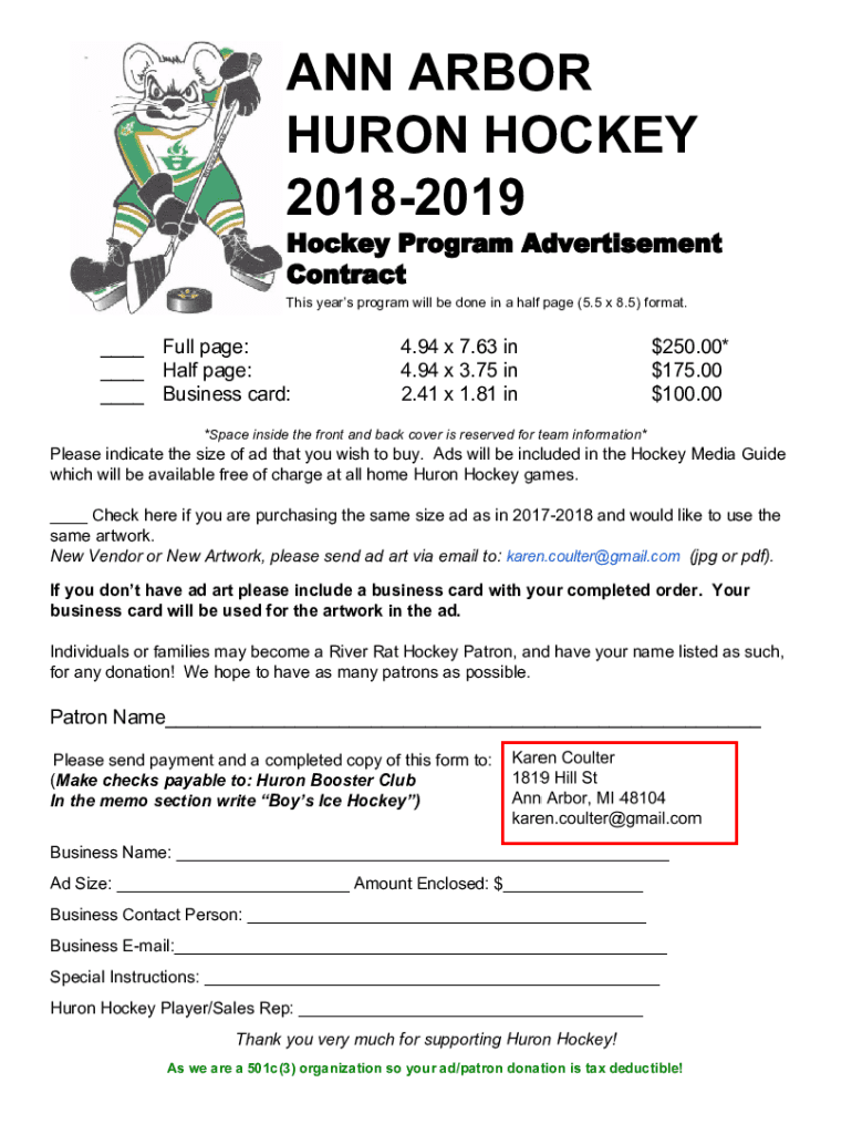 ANN ARBOR HURON HOCKEY 20182019Hockey Program Advertisement Contract This year's program will be done in a half page (5.5 × 8.5) format. Full page: Half page: Business card:4.94 × 7.63 in 4.94 ×