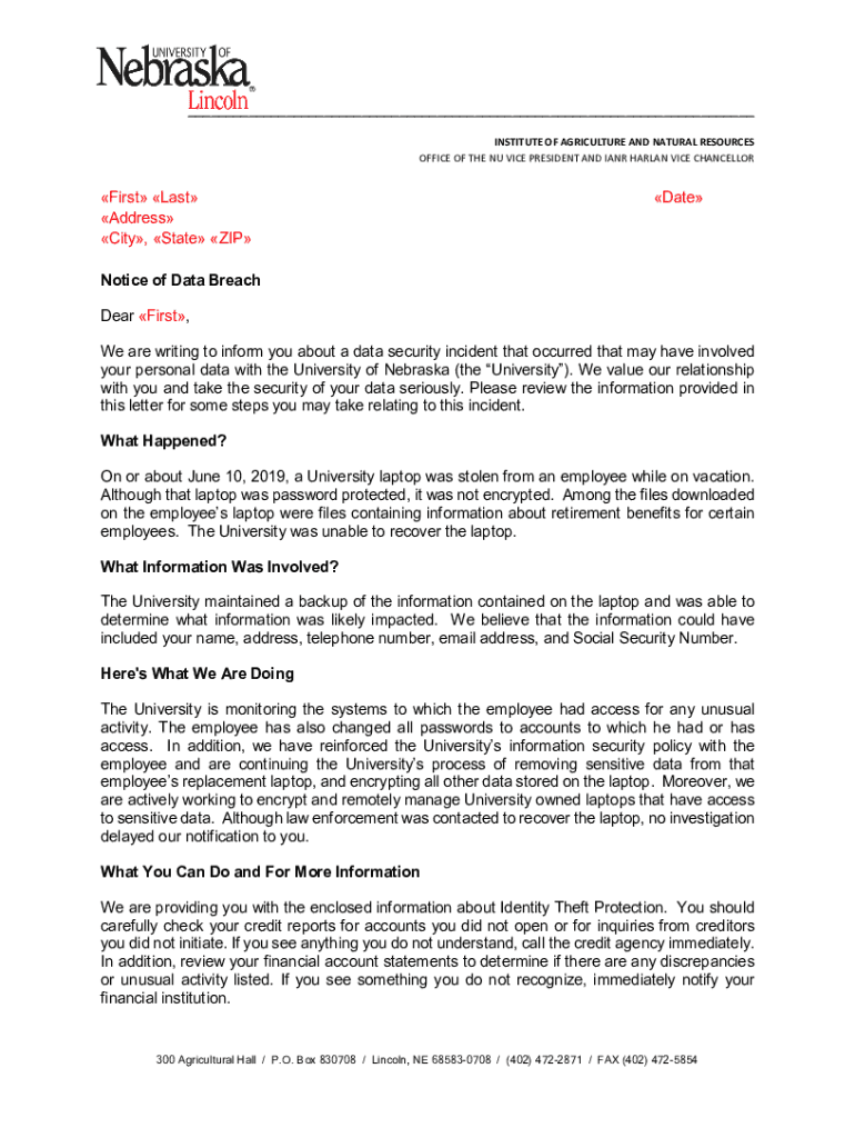INSTITUTE OF AGRICULTURE AND NATURAL RESOURCES OFFICE OF THE NU VICE PRESIDENT AND ANR HARLAN VICE CHANCELLORFirst Last Address City, State ZIPDateNotice of Data Breach Dear First, We are writing