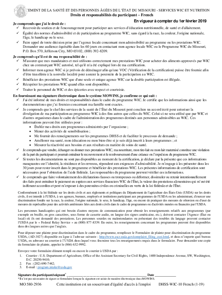DEPARTMENT DE LA SENT ET DES PERSONNEL GES DEL TAT DU MISSOURI SERVICES WIC ET NUTRITIONDroits et responsibility Du participant French En liqueur computer Du 1er frier 2019Je comp rends Que j 'ai