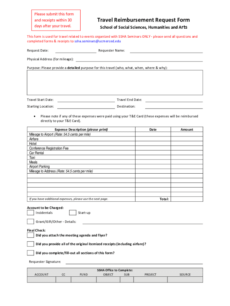 Pleasesubmitthisform andreceiptswithin30 daysafteryourtravel. TravelReimbursementRequestForm SchoolofSocialSciences, HumanitiesandArtsThis form is used for travel related to events organized with