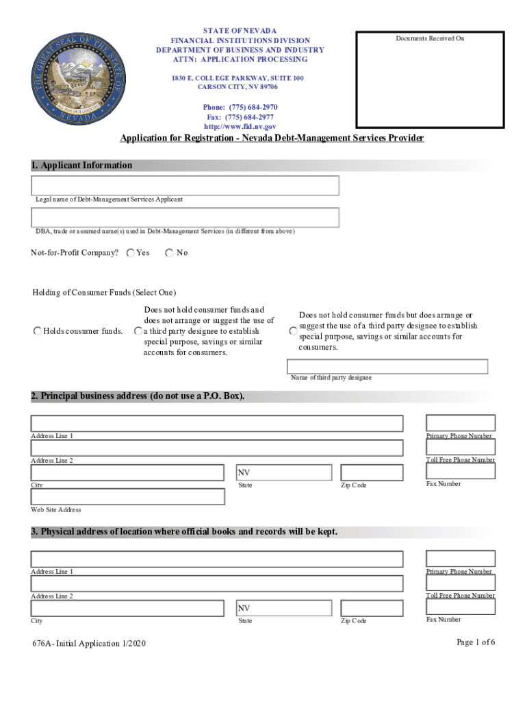 STATE OF NEVADA FINANCIAL INSTITUTIONS DIVISION DEPARTMENT OF BUSINESS AND INDUSTRY ATTN: APPLICATION PROCESSINGDocuments Received On1830 E. COLLEGE PARKWAY, SUITE 100 CARSON CITY, NV 89706Phone: