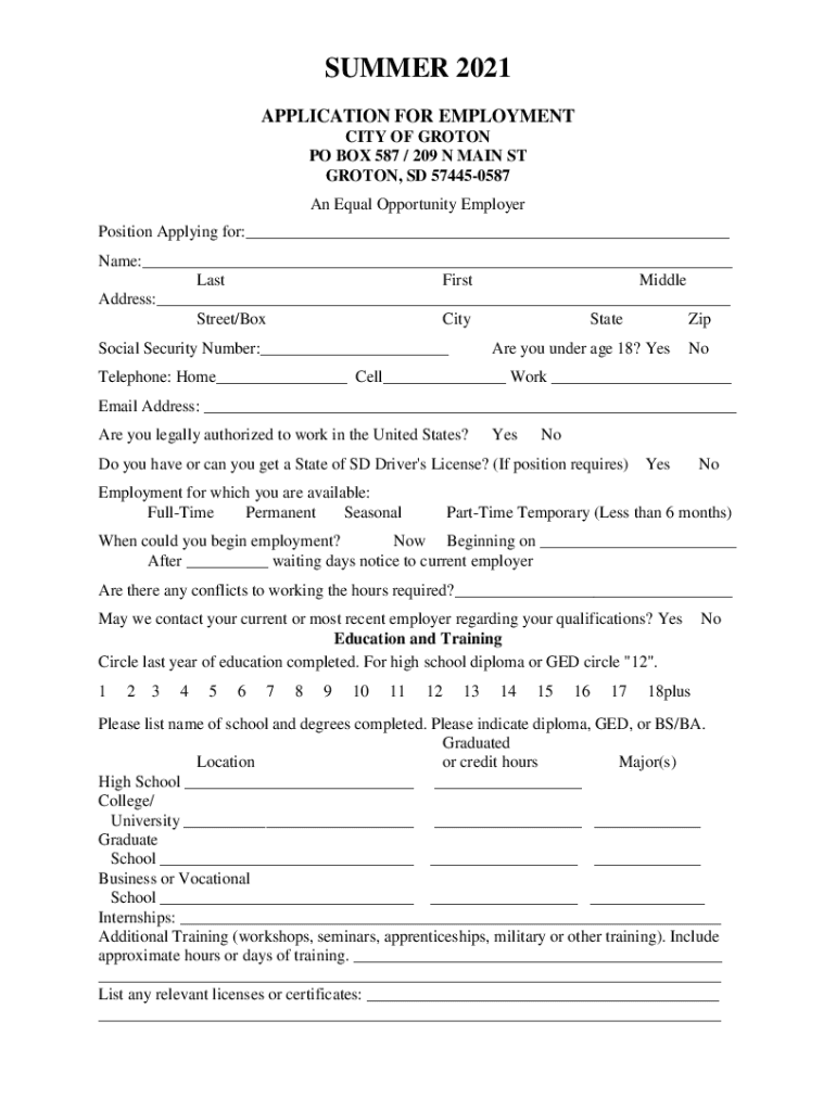 SUMMER 2021 APPLICATION FOR EMPLOYMENT CITY OF PROTON PO BOX 587 / 209 N MAIN ST PROTON, SD 574450587 An Equal Opportunity Employer Position Applying for: Name: Last First Middle Address: Street/Box