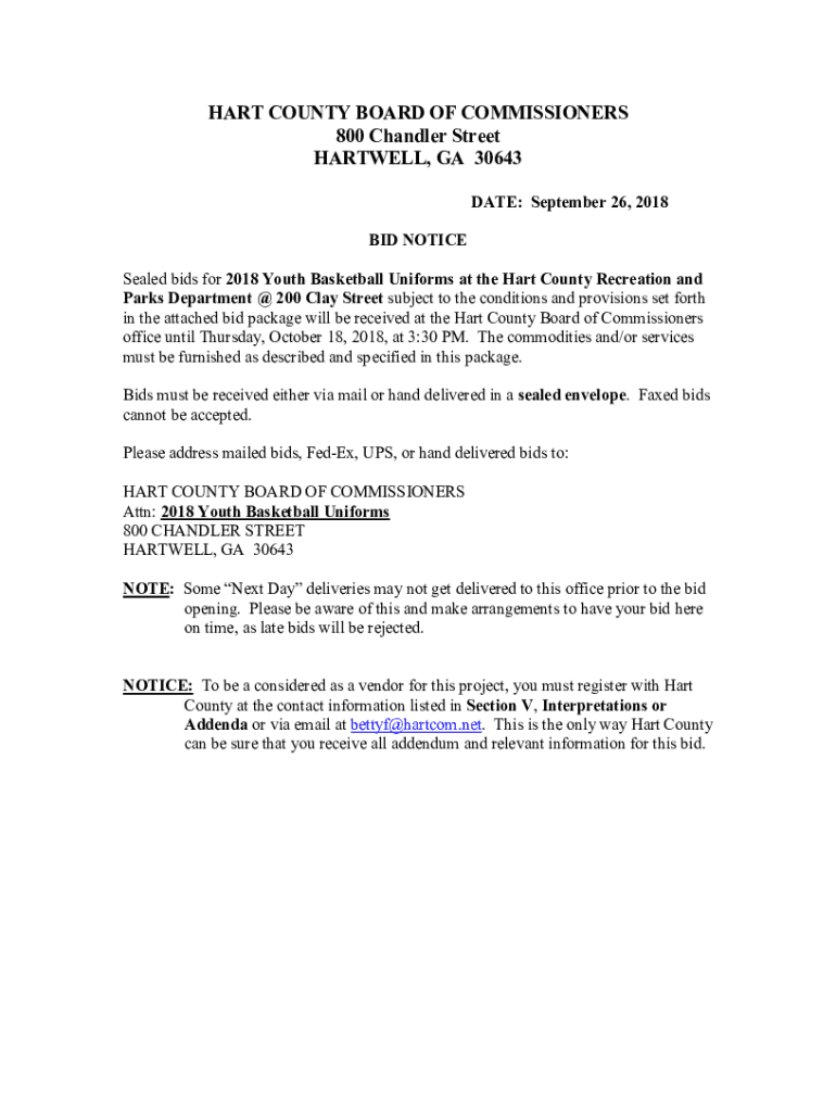HART COUNTY BOARD OF COMMISSIONERS 800 Chandler Street HARTWELL, GA 30643 DATE: September 26, 2018, BID NOTICE Sealed bids for 2018 Youth Basketball Uniforms at the Hart County Recreation and Parks