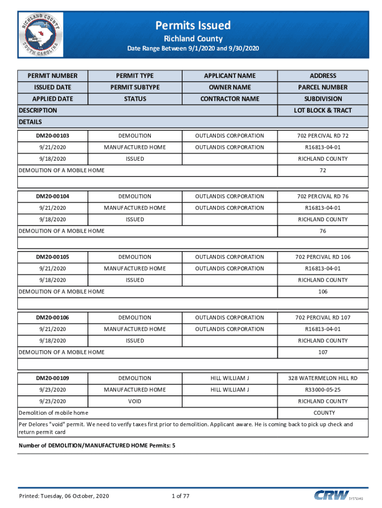 Permits Issued Richland County Date Range Between 9/1/2020 and 9/30/2020PERMIT NUMBERPERMIT TYPEAPPLICANT NAMEADDRESSISSUED DATEPERMIT SUBTYPEOWNER NAMESPACE NUMBERAPPLIED DATESTATUSCONTRACTOR NAMESUBDIVISIONDESCRIPTIONLOT