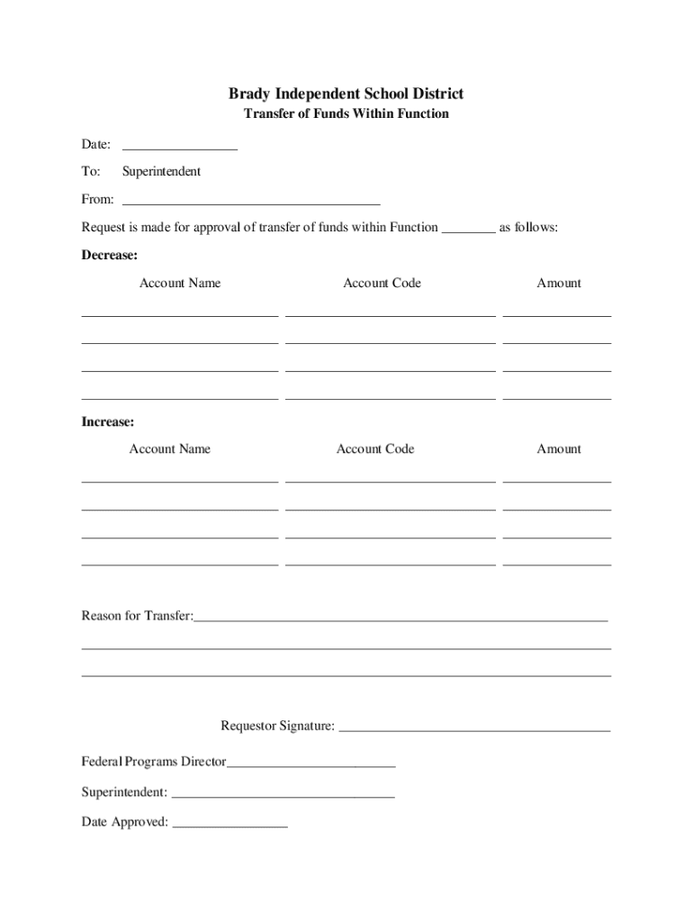 Brady Independent School District Transfer of Funds Within Function Date: To:SuperintendentFrom: Request is made for approval of transfer of funds within Function as follows: Decrease: Account NameAccount