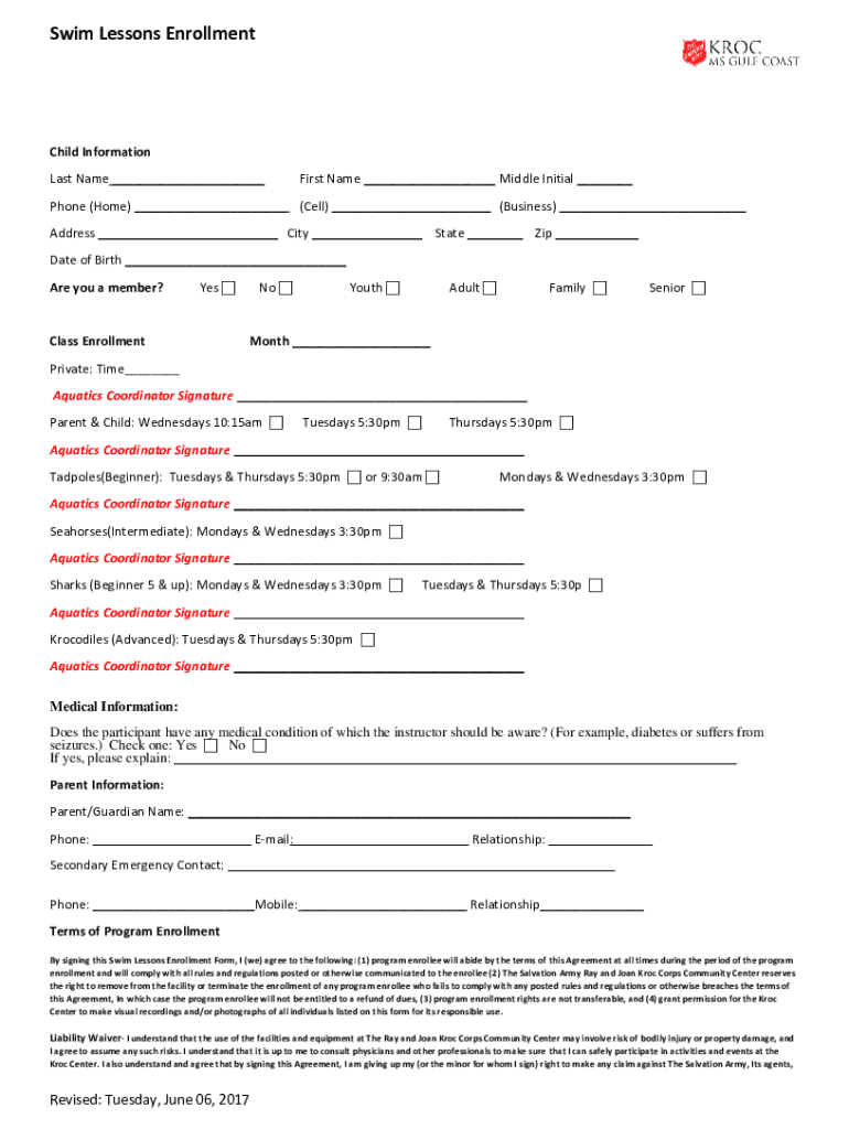 Swim Lessons EnrollmentChild Information Last Name First Name Middle Initial Phone (Home) (Cell) (Business) Address City State Zip Date of Birth Are you a member? Yes Class Enrollment No Youth Adult