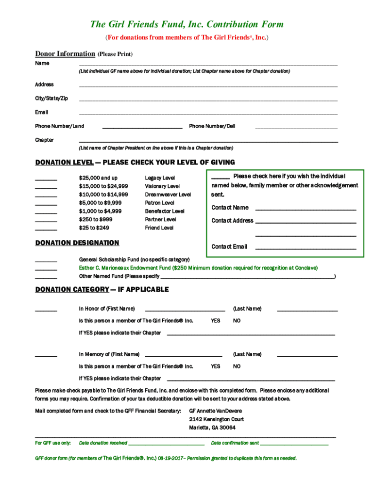 The girlfriends Fund, Inc. Contribution Form (For donations from members of The girlfriends, Inc.) Donor Information (Please Print) Name (List individual GF names above for individual donation; List