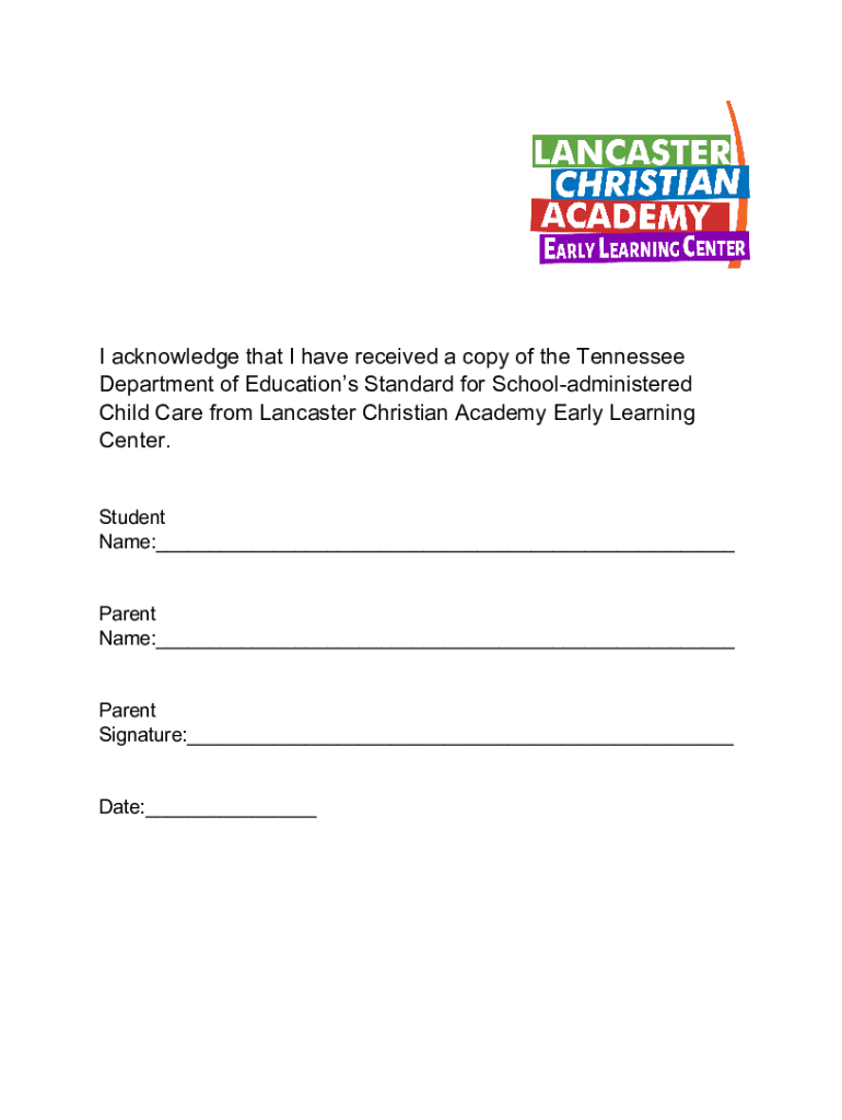 I acknowledge that I have received a copy of the Tennessee Department of Educations Standard for School administered Child Care from Lancaster Christian Academy Early Learning Center. Student Name: