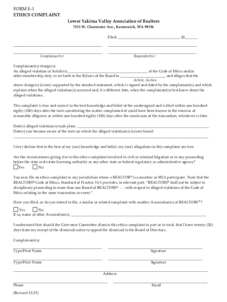 FORM E1 ETHICS COMPLAINT Lower Yakima Valley Association of Realtors 7151 W. Clearwater Ave., Kennewick, WA 99336 Filed:, 20 Complainant(s) Respondent(s)Complainant(s) charge(s): An alleged violation