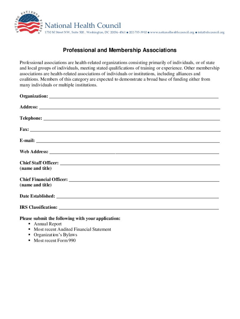 National Health Council 1730 M Street NW, Suite 500, Washington, DC 200364561 2027853910 www.nationalhealthcouncil.org info council. Preprofessional and Membership Associations Professional associations