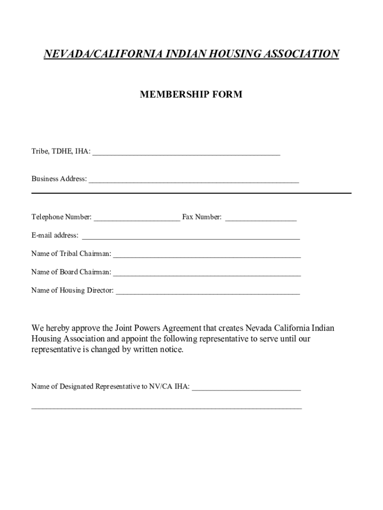 NEVADA/CALIFORNIA INDIAN HOUSING ASSOCIATION MEMBERSHIP Formative, THE, IRA: Business Address: Telephone Number: Fax Number: Email address: Name of Tribal Chairman: Name of Board Chairman: Name of