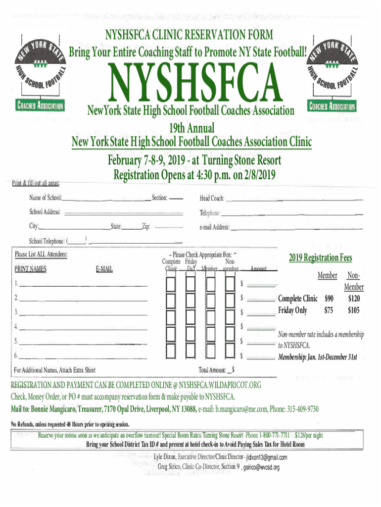 NYSHSFCA CLINIC RESERVATION FORM Bring Your Entire Coaching Staff to Promote NY State Football!NYSHSFCAPrint & fill out all areas:New York State High School Football Coaches Association 19th Annual