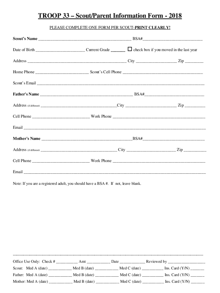 TROOP 33 Scout/Parent Information Form 2018 PLEASE COMPLETE ONE FORM PER SCOUTING CLEARLY! Scouts Name BSA# Date of Birth Current Grade o check box if you moved in the last readdress City Zip Home