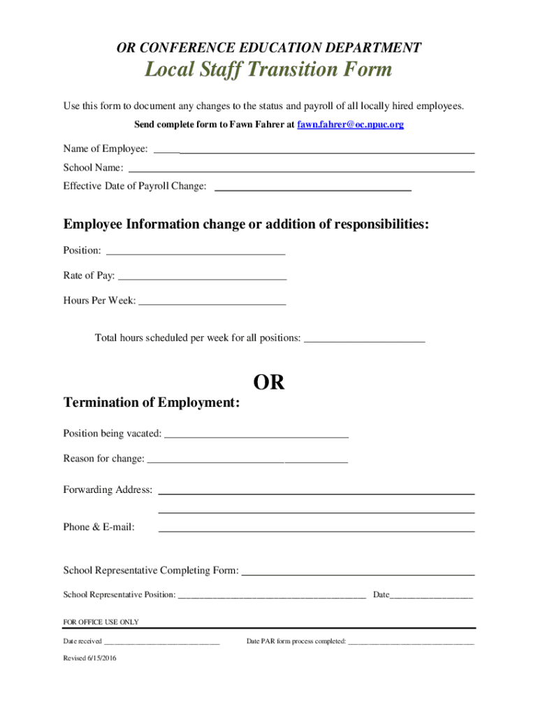 OR CONFERENCE EDUCATION Departmental Staff Transition Form Use this form to document any changes to the status and payroll of all locally hired employees. Send complete form to Fawn Fairer at fawn.