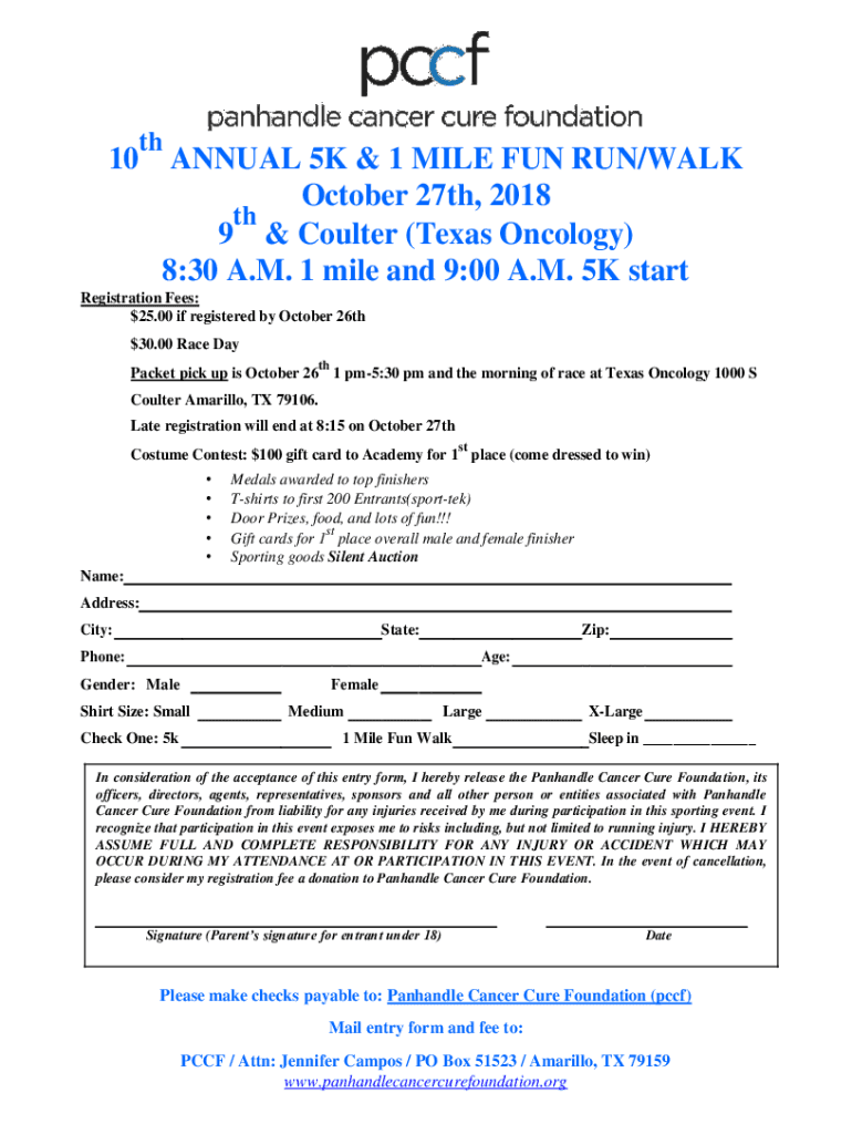10thANNUAL 5K & 1 MILE FUN RUN/WALK October 27th, 2018 TH 9 & Coulter (Texas Oncology) 8:30 A.M. 1 mile and 9:00 A.M. 5K startRegistration Fees: $25.00 if registered by October 26th $30.00 Race Day