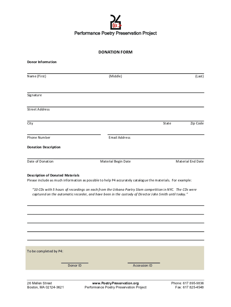 Performance Poetry Preservation ProjectDONATIONFORM DonorInformation Name(First) (Middle) (Last) Signature StreetAddress City State Opcode PhoneNumber Misaddress DonationDescription DateofDonation