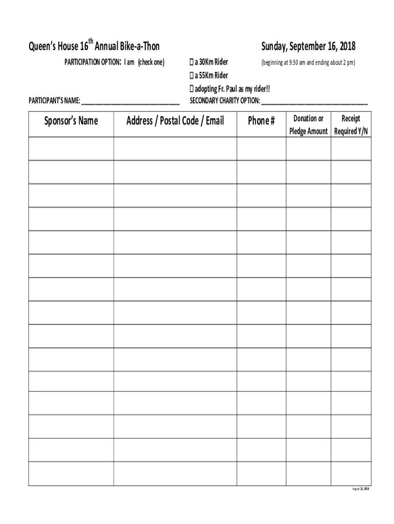 Queens House 16th Annual Keaton PARTICIPATION OPTION: I am (check one)PARTICIPANTS NAME: Sponsors Name Sunday, September 16, 2018, a 30Km Rider (beginning at 9:30 am and ending about 2 pm) a 55Km