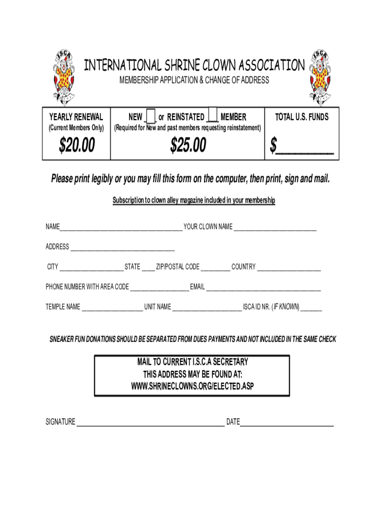 INTERNATIONAL SHRINE CLOWN ASSOCIATION MEMBERSHIP APPLICATION & CHANGE OF ADDRESSTOTAL U.S. FUNDS(Current Members Only)NEW or REINSTATED MEMBER(Required for New and past members requesting reinstatement)$$$20.0025.00