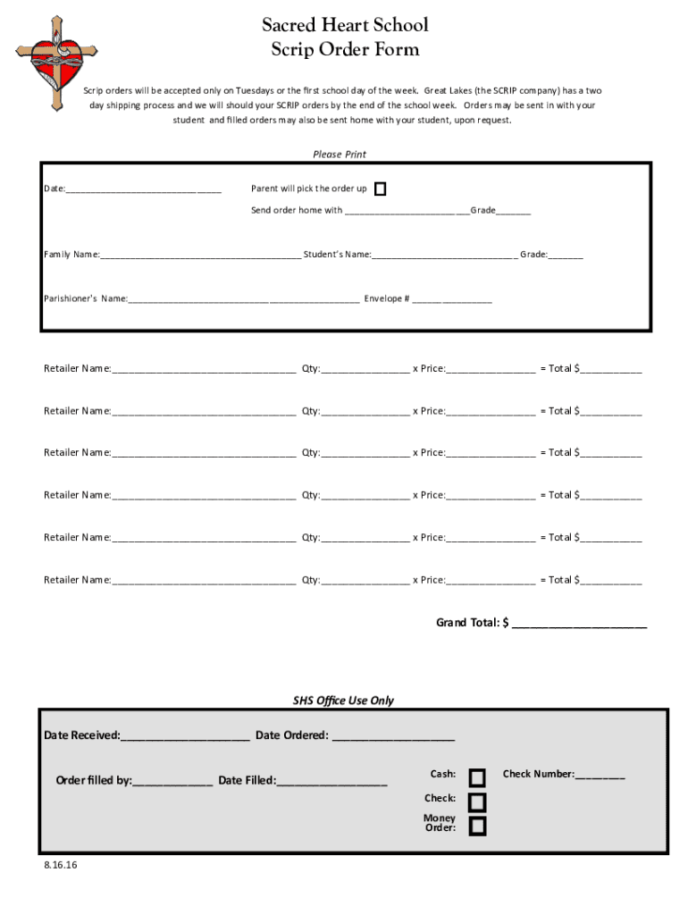 Sacred Heart School Scrip Order Form Scrip orders will be accepted only on Tuesdays or the first school day of the week. Great Lakes (the SCRIP company) has a two-day shipping process, and we will,