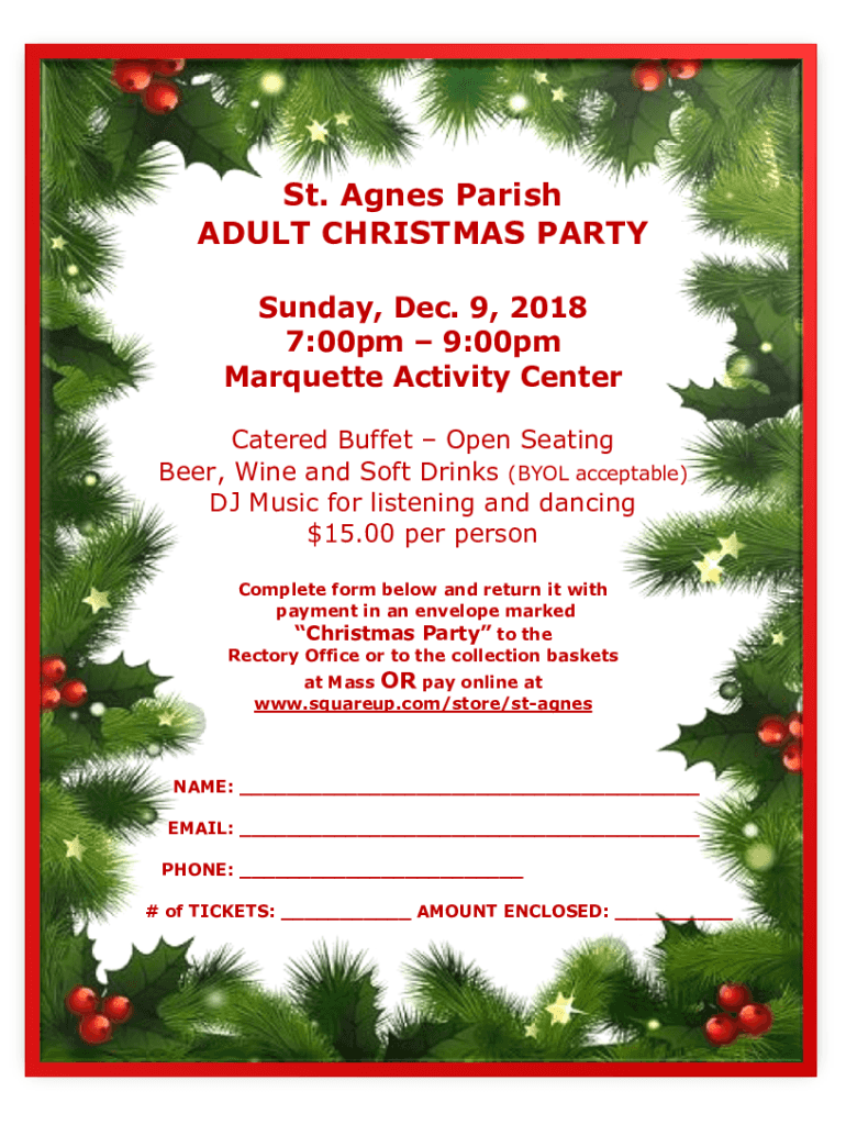 St. Agnes Parish ADULT CHRISTMAS PARTY Sunday, Dec. 9, 2018 7:00pm 9:00pm Marquette Activity Center Catered Buffet Open Seating Beer, Wine and Soft Drinks (BYOB acceptable) DJ Music for listening