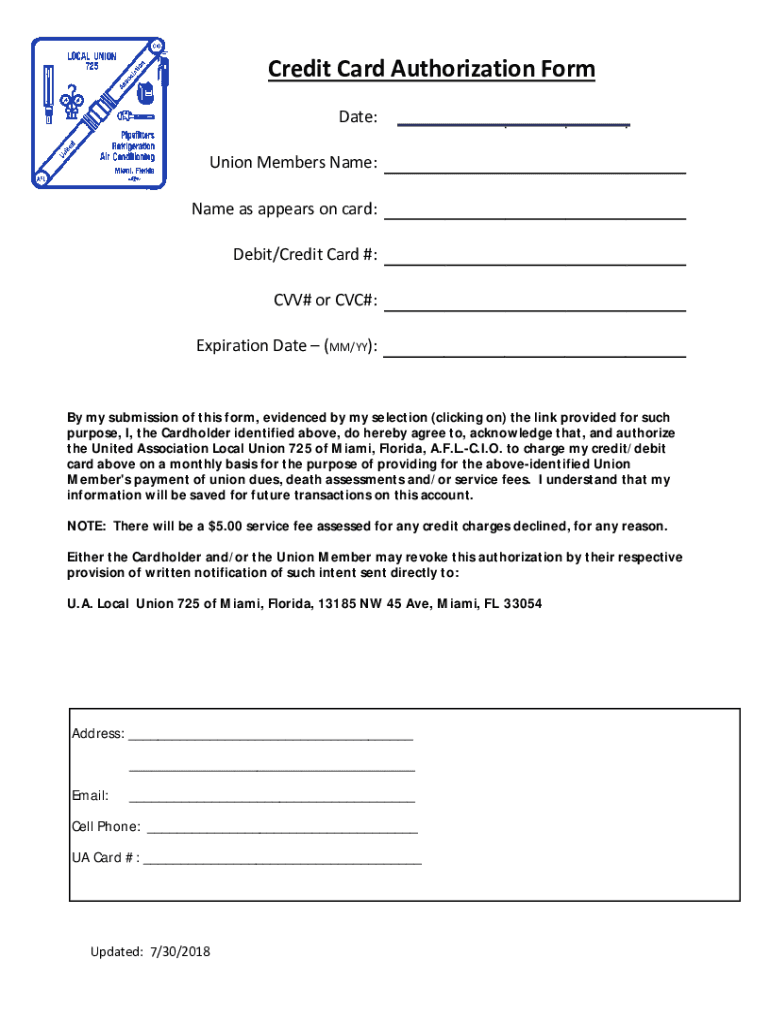 Credit Card Authorization Form Date: Union Members Name: Name as appears on card: Debit/Credit Card #: CVV# or CVC#: Expiration Date (MM/BY):By my submission of this form, evidenced by my selection