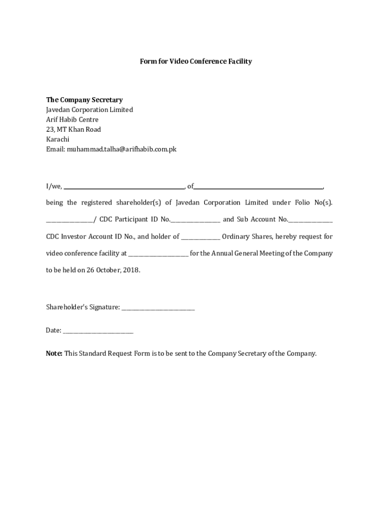 Form for Video Conference Facilitate Company Secretary Javelin Corporation Limited Arif Habit Center 23, MT Khan Road Karachi Email: Muhammad. Tasha arifhabib.com.pkI/we,, of, being the registered