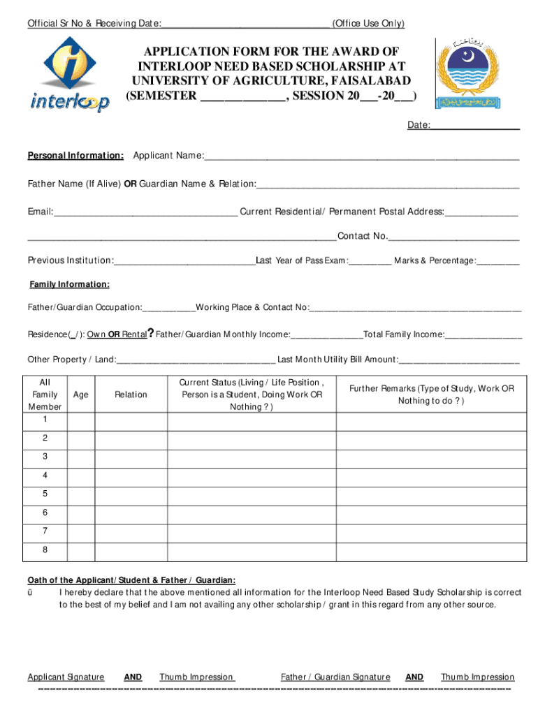 Official Sr Now & Receiving Date: (Office Use Only)APPLICATION FORM FOR THE AWARD OF INTERLOCK NEED BASED SCHOLARSHIP AT UNIVERSITY OF AGRICULTURE, FAISALABAD (SEMESTER, SESSION 20 20) Date: Personal