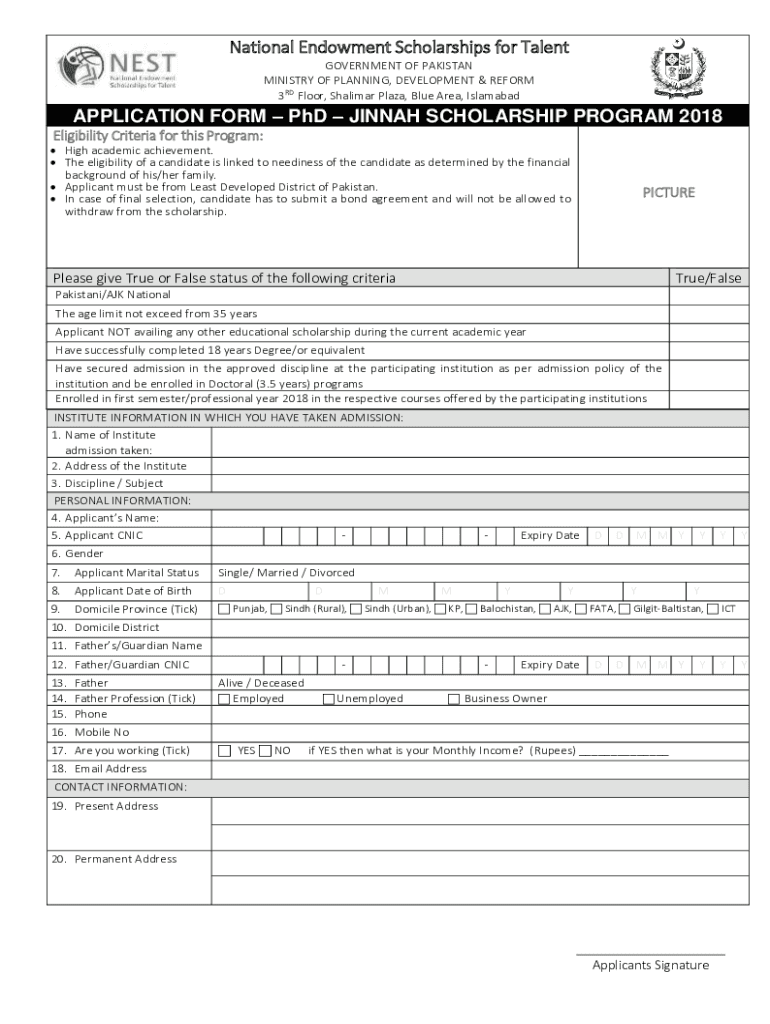 National Endowment Scholarships for Talent GOVERNMENT OF PAKISTAN MINISTRY OF PLANNING, DEVELOPMENT & REFORM 3RD Floor, Shalwar Plaza, Blue Area, IslamabadAPPLICATION FORM PhD JINNAH SCHOLARSHIP PROGRAM