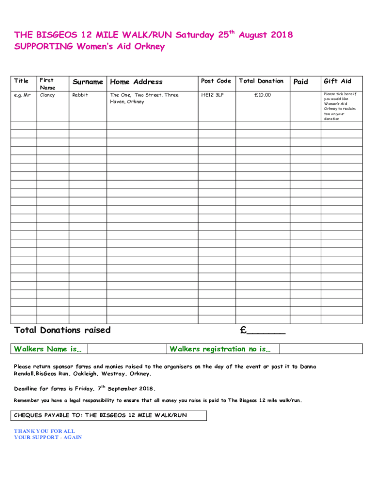 THE BINGES 12-MILE WALK/RUN Saturday 25th August 2018 SUPPORTING Women's Aid OrkneyTitleFirst NameSurname Home Address Post Code.g. MrClancyRabbitHE12 3LPThe One, Two Street, Three Haven, OrkneyTotal