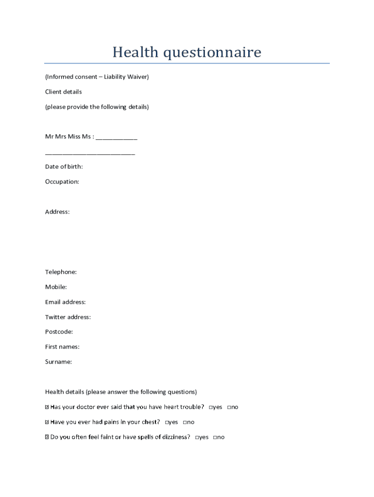 Health questionnaire (Informed consent Liability Waiver) Client details (please provide the following details)Mr Mrs Miss Ms : Date of birth: Occupation:Address:Telephone: Mobile: Email address: Twitter