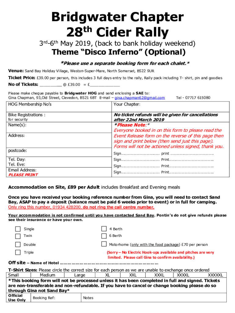 Bridgewater Chapter 28th Cider Rally 3rd6th May 2019, (back to bank holiday weekend)Theme Disco Inferno (Optional)*Please use a separate booking form for each chalet.* Venue: Sand Bay Holiday Village,