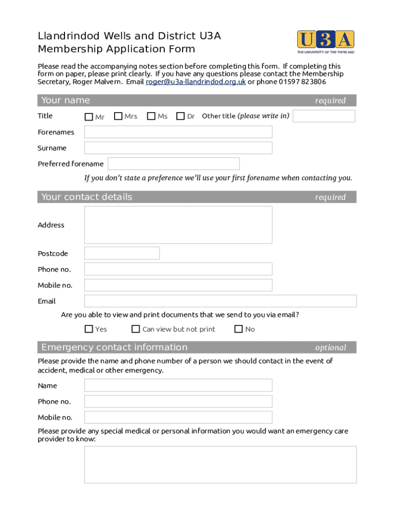 Get the free Llandrindod Wells and District U3A Membership Application Form