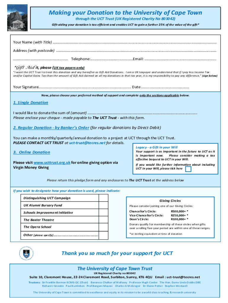 Making your Donation to the University of Cape Town through the ACT Trust (UK Registered Charity No 803042) Gift aiding your donation is tax efficient and enables ACT to gain a further 25% of the