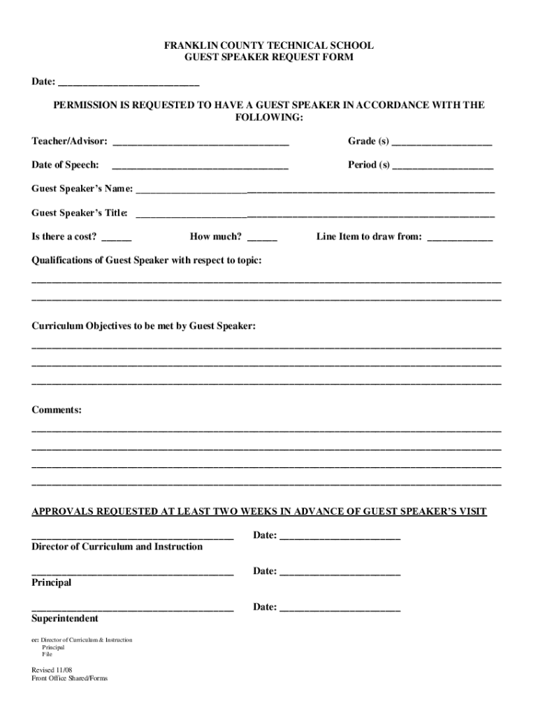 FRANKLIN COUNTY TECHNICAL SCHOOL GUEST SPEAKER REQUEST FORM Date: PERMISSION IS REQUESTED TO HAVE A GUEST SPEAKER IN ACCORDANCE WITH THE FOLLOWING: Teacher/Advisor: Grade (s) Date of Speech:Period